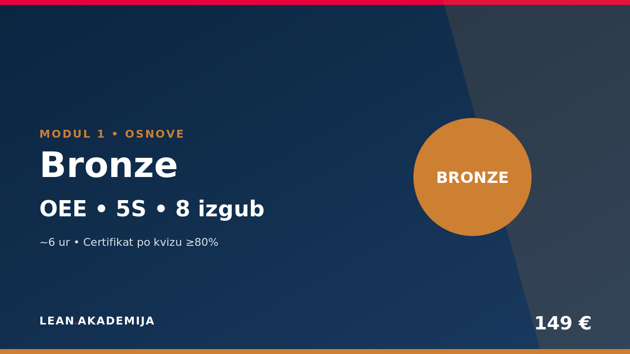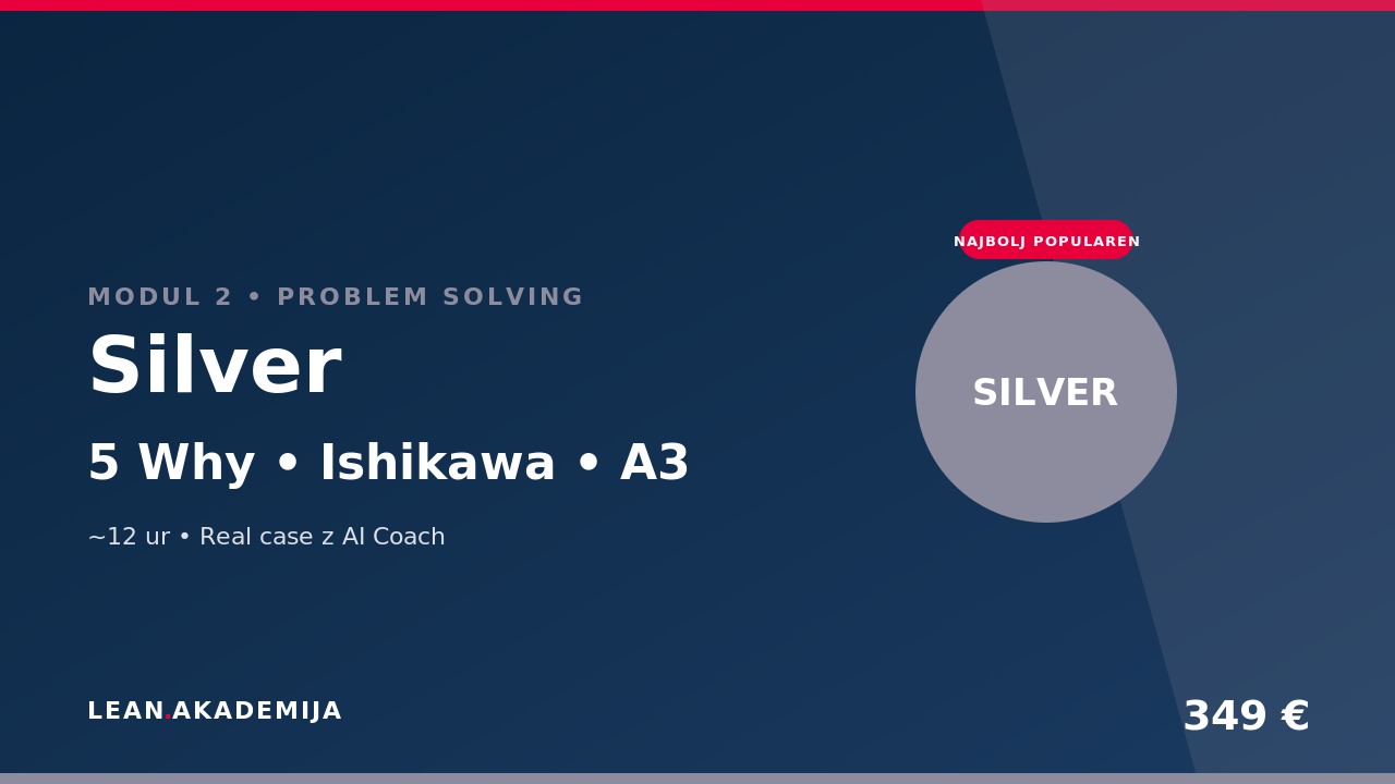 Interaktivna akademija z AI Coach vodeno pot: 5 Why, Ishikawa (6M), A3 Report, IS/IS NOT + Pareto, QRQC in Real Case v platformi. Ne video tečaj — ti rešuješ svoj problem korak za korakom z AI Coach vodenjem. Silver certifikat ob uspešnem 6-koračnem projektu.