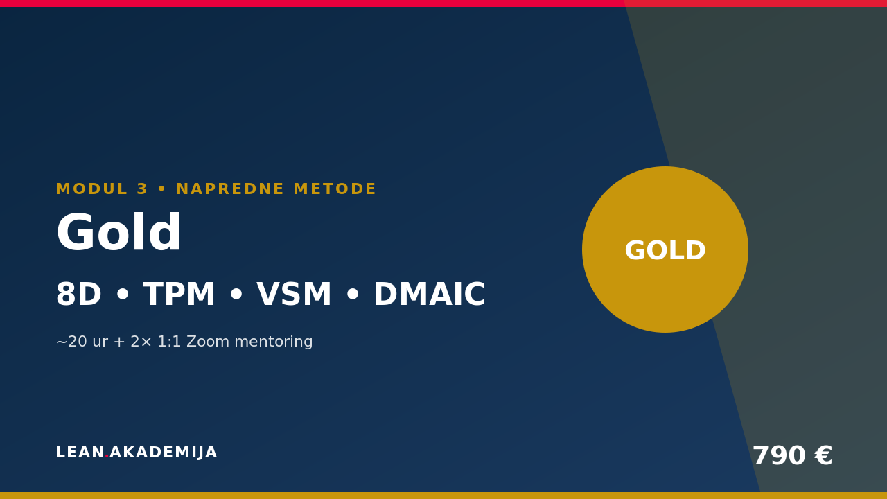 Gold paket (Green Belt): 8D report, Value Stream Mapping, DMAIC framework, Toyota Kata coaching. Vključuje 2 live Zoom sesije z mentorjem + real case z AI Coach. Mednarodno priznan Green Belt certifikat.